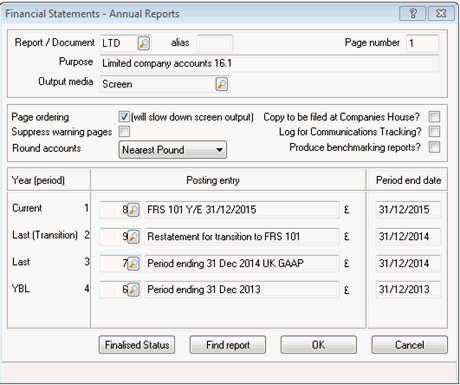 When generating a set of accounts, where the first year of adoption of FRS 101 is identified, the following screen displays.