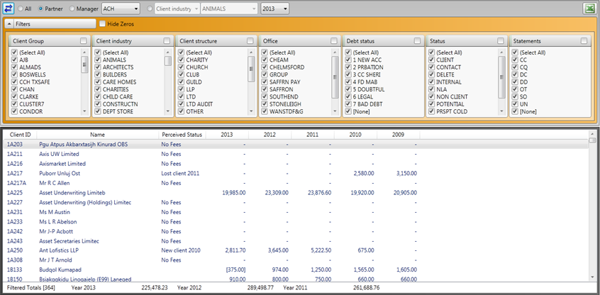 The perceived status is based on your billing history available from the IRIS Fees Ledger. The Dashboard looks at the yearly historical billing pattern to determine the status. This works best if you look at the last complete year of billing, if you look at the current year in progress all your clients will be shown as lost until they have been billed at least once. There are four different types of perceived status, these are :