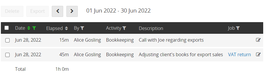 If you wish to delete a time entry, tick the relevant entry (or entries) and select Delete.