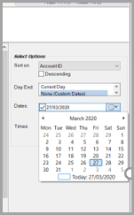 To change the date range/time choose the option None (Custom Dates) from the Day End section. Once you have done this make sure you tick the boxes next to dates/time for both the start and finish. You can then use the drop down box to choose your start date/time and end date/time or you can just type this in: