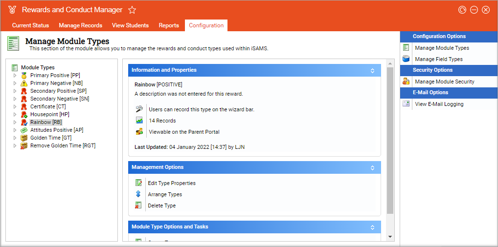 - Open the Rewards & Conduct module and select the Configuration tab.