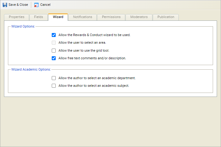- Under the Wizard tab, select or deselect Allow the Rewards & Conduct Wizard to be used: