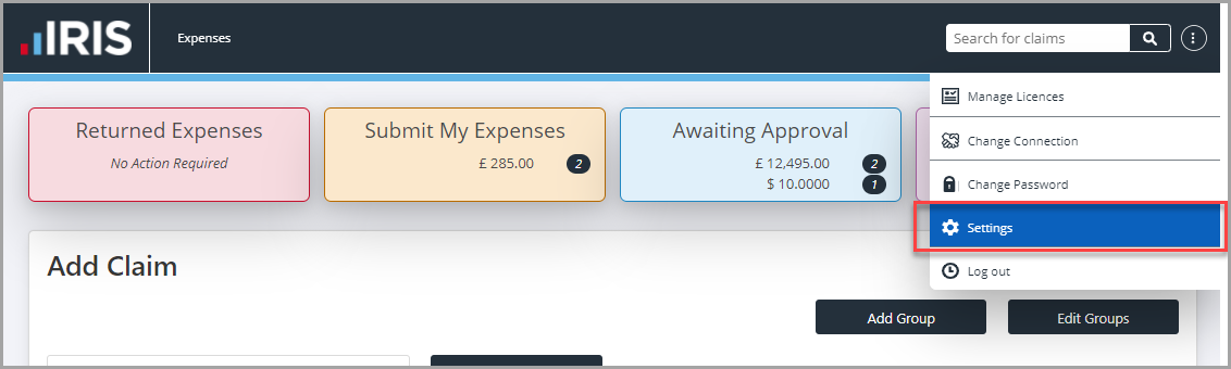 (The Submit My Expenses panel displays the total of claims that have been entered in IRIS Expenses that you have not yet submitted for approval. The total value of claims is displayed with the number of claim groups displayed adjacent in brackets, e.g. £10.00 (1).