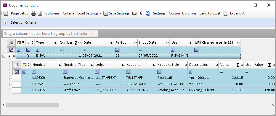 To view a posted claim in PS Accounting, you can run a document enquiry or, if known, view the details of the account to which the document was posted. The Description of the Expense Control line (for example, nominal LLL9560) is displayed as the name of the claim group in which the expense was submitted.