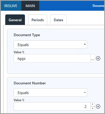 2. The Document Enquiry Criteria dialog is displayed. Select Equals from the Document Type drop-down list.