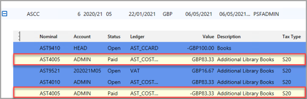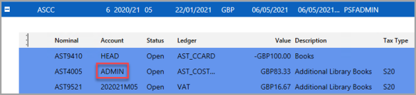 When the document has been edited, the new account is displayed and the old account has been reversed and allocated on the same document.