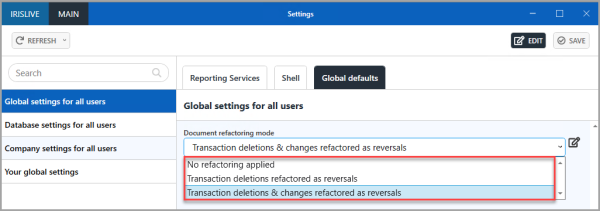In previous versions of IRIS Financials, when a user changes a document, the original document is overwritten with the changes. In Version 7 of IRIS Financials there are three different settings to deal with changing existing documents, which is now carried out using the EDIT function.