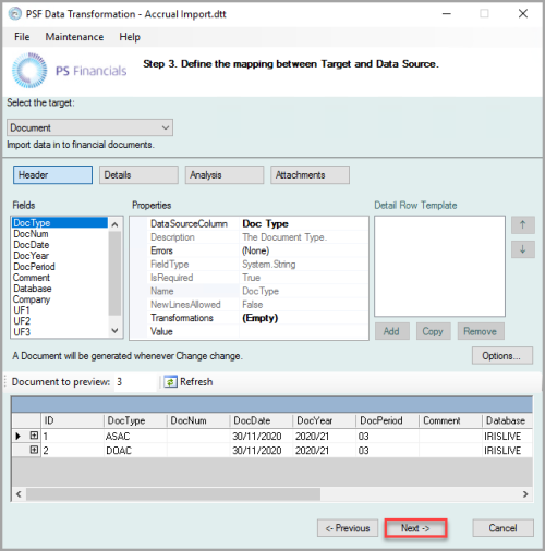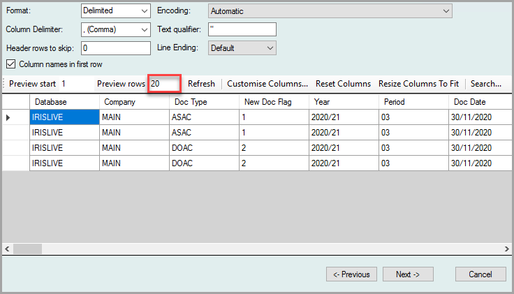 A preview of the entries that are to be imported are displayed. You can increase the preview rows if needed. Select Next.If you scroll to the right, a large number of unused columns are displayed. This is intentional as these fields are typically not required for accruals imports.