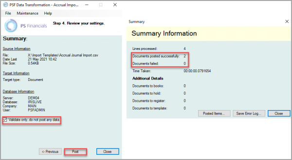 5. The Step 4 dialog is displayed, containing a summary of the import. Select Validate only, do not post any data, then select Post to check the import for any errors before posting to the database. The Summary dialog is displayed, check the posting details, then select Close to return to the Step 4 dialog.