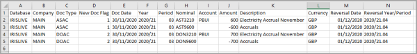 The sample data contains accrual information for two example locations - AST and DON. The New Doc Flag column determines which detail lines form part of the same document when they are imported into IRIS Financials, as shown in the following graphic. The information included in the download is for demonstration purposes only and your own nominal and account codes may differ to that of the demonstration system.