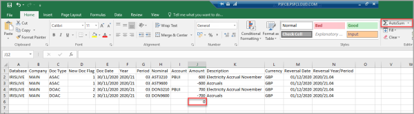 16. Repeat the previous steps to complete the journal. Before importing, you must check the document balances to zero. The easiest way to do this is select the cell immediately beneath the last entry in the Amount column (Column H), then select the AutoSum icon on the Excel toolbar. If the values do not balance to zero, check all the values entered in the Amount column for each individual document being imported and correct any discrepancies.