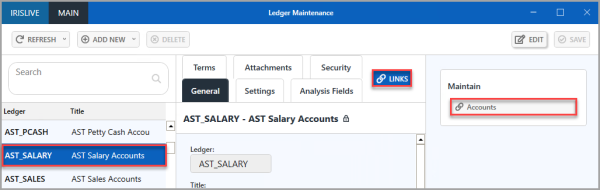 3 - Go to Maintenance > Ledgers, then select the ledger linked to the Nominal to which you are posting the Accrual Journal.