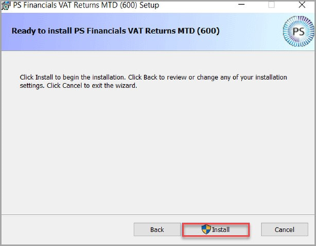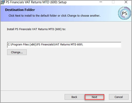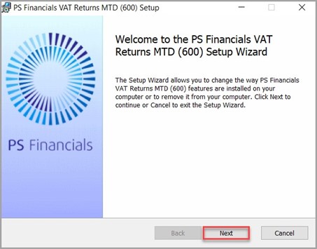 Follow the steps in the PS Financials VAT Returns MTD (600) Setup wizard to install the software. Select Next.