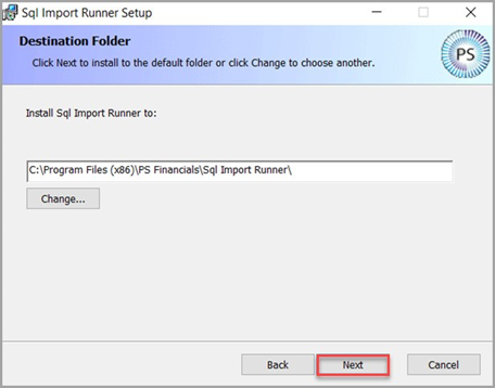 The next page of the wizard displays the destination for the program installation. If required, select Change to choose an alternative location. Select Next.