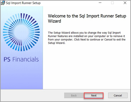 The SQL Import Runner Setup wizard is launched. Select Next .