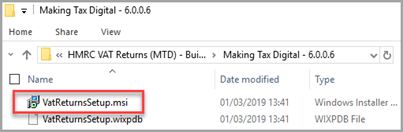 To install the VAT Returns MTD software, select the VatReturnsSetup.msi file.