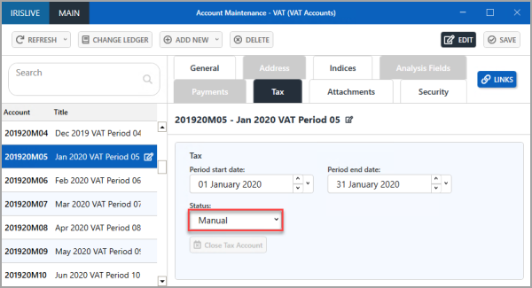 3. The Account Maintenance window displays. Select the required VAT period from the left-hand panel, select the Tax tab, and check the Status of Manual is selected for the VAT period. If you need to update the status for the period, select EDIT, select Manual from the Status drop-down list, then select SAVE.