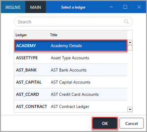 2. The Select a ledger dialog displays. Select ACADEMY - Academy Details .