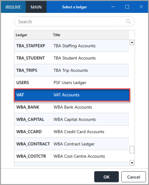 2. The Select a ledger dialog displays. Double-select to select VAT - VAT Accounts .