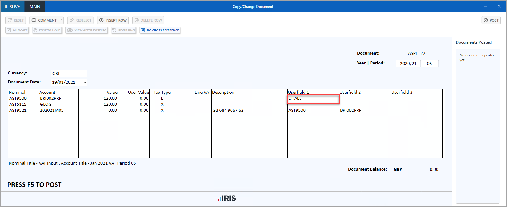 3. The System Journal Input form is displayed. Delete the existing approver in Userfield 1 on the purchase ledger control line and enter the new approver.