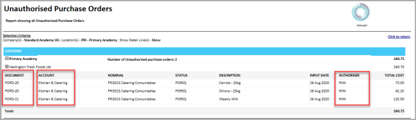 5. The report displays any purchase orders matching the criteria you have specified. The report displays unauthorised documents, document numbers, the accounts and the authoriser can be established (if unknown).