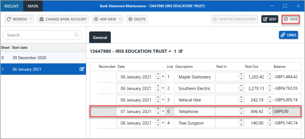The Bank Statement Maintenance window is displayed listing any existing bank statement sheets in the left-hand panel. Select the required statement. All available transactions for that statement are displayed in the right-hand panel. Select EDIT.
