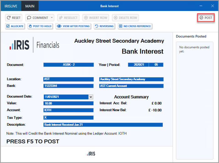 If your establishment / organisation uses bank interest, then any bank interest that is received is posted in IRIS Financials using a document input form.
