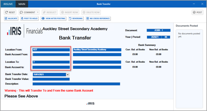 16. A blank Bank Transfer document input form is displayed. The Bank Transfer document input form you have completed is listed in the Documents Posted panel on the right-hand side.