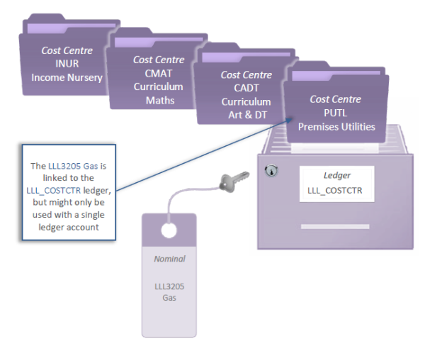 For example, the LLL3205 Gas nominal is linked to the LLL_COSTCTR ledger. All cost centre account within this ledger are available for selection because of this link, as shown in the following graphic. Effectively, the LLL3205 nominal has the key to the LLL_COSTCTR filing cabinet drawer and all the folders within it.