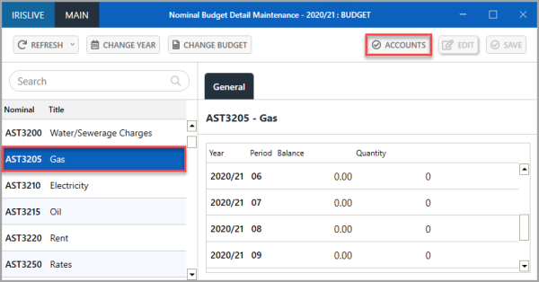 This information is entered by selection the required nominal from the Nominal Budget Detail Maintenance window, then selecting ACCOUNTS, (accessed by selecting Maintenance > Nominal Budget Details from the menu).