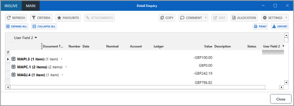 • A Trial balance is run on one period at a time to identify the time frame during which the imbalance arose. Once you know the period, run an detail enquiry on the 9515 nominal for that period only. The INTR transactions display the document number of the original transaction in User Field 2 (grouping by this field provides the total for each document). For more information, please see Running a Trial Balance and Running a Detail Enquiry.