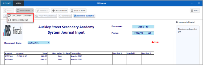 - The PSFJournal document input form populated with the details of the document is displayed. Select COMMENT, then select DOCUMENT COMMENT.