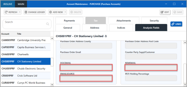 The email addresses used by these modules are stored in IRIS Financials via the Analysis Fields tab of the applicable account.
