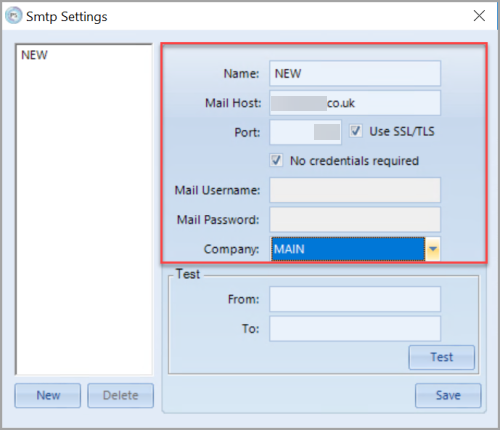 2. The Smtp Settings dialog is displayed with all available fields greyed out. Select New.