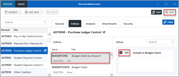 By default, when posting a purchasing document the budget that has been assigned to the ledger and nominal account in IRIS Financials(via Maintenance > Budgets) is checked. It is possible to set just the ledger account to be checked.