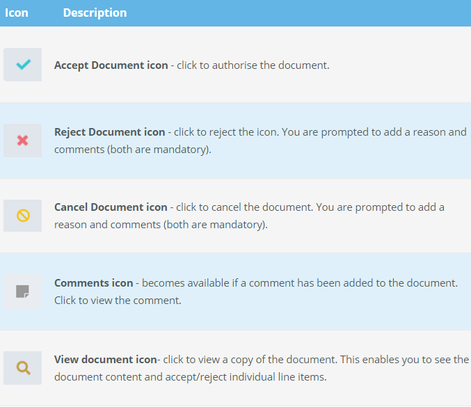 Approvers must have applicable access levels in order to authorise documents. If not, the Document Authorisation icon is not visible and/or applicable documents not available for authorisation. For more information, refer to Setting Up IRIS Purchasing Document Approvers.