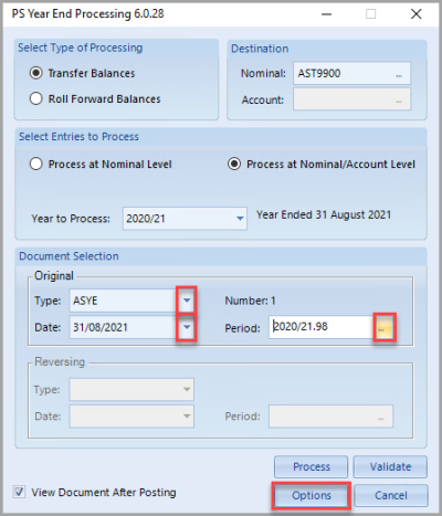 5. In the Document Selection panel, select ASYE (where AS represents the location code of the document type) from the Type drop-down list, select the end date for the current financial year from the Date drop-down calendar, then select Drill (...) in Period, then double-select to select period .98 for the current financial year from the List of Periods window. Then select Options.