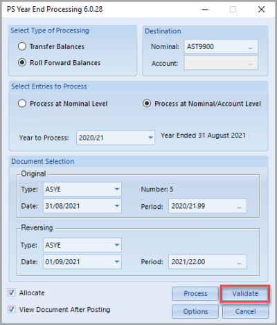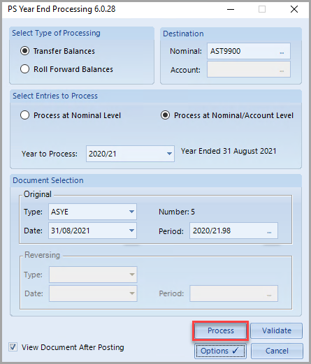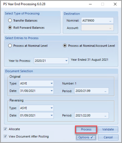 If using version 6.0.28 or higher of the PS Year End Processing module, as the Trading and Balance Sheet nominals are automatically identified when processing, in Nominal Range from you must select nominals 1000 to 9900.