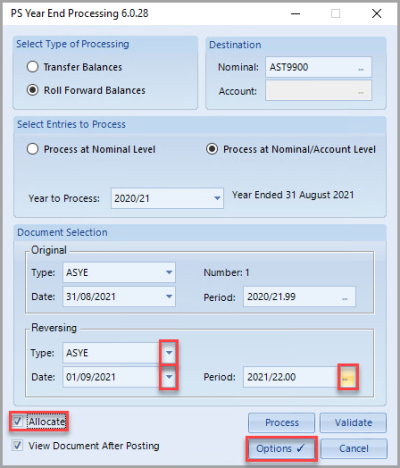 2. Part 2 – Rolls forward all balance sheet nominals into period .99 and reverses these into period 00 to form the opening balances for the new financial year.