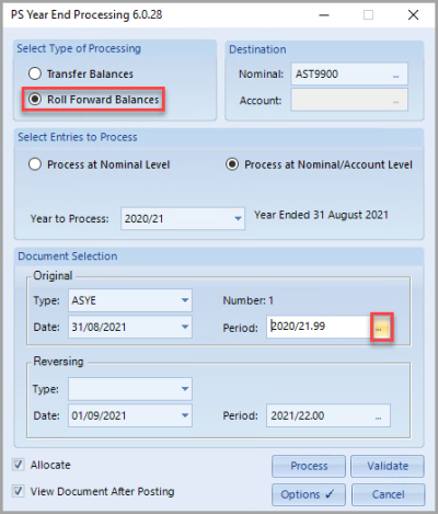 3. The Reversing options can then be selected. Select ASYE (where AS represents the location code of the document type) from the Type drop-down list, select the start date for the new financial year from the Date drop-down calendar, then select Drill (...) in Period, then double-select to select period .00 for the new financial year from the List of Periods window.