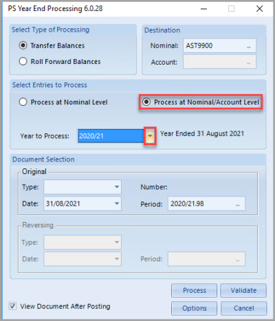 4. In the Select Entries to Process panel, select Process at Nominal/Account Level, then select the required financial year from the Year to Process drop-down list.
