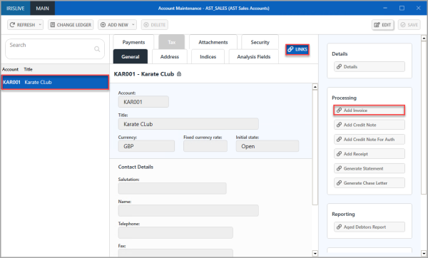 6. Double-select in the Account field then double-select the required customer from the SelectAST_SALES account dialog (where AST represents the location code).