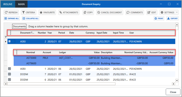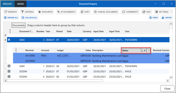 An enquiry is used to view documents that have been added to IRIS Financials to record your establishment/organisation's transactions. From any of the enquiry windows you can customise the enquiry display, for example, adjust the column widths or add and remove columns to only view the information you need. You can also use enquiries to export data in a report form. For more information, please see Exporting Data to Excel.