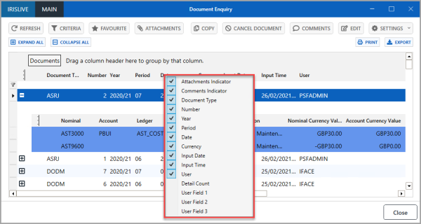 - On the enquiry window, right-select anywhere on the document column header bar (or where available, the detail line column header bar).