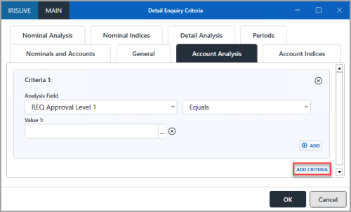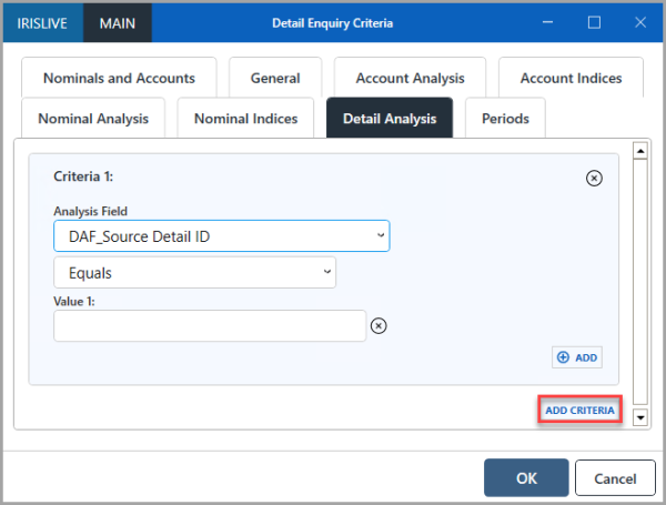 1. To select criteria for detail analysis fields, select ADD CRITERIA.