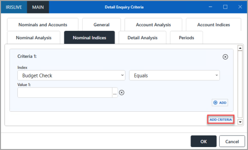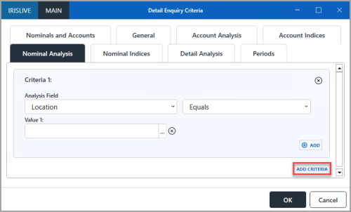 2. To search on more than one nominal, ledger, or account, select ADD from the applicable Nominal, Ledger, or Account panel to display an additional numbered Value field, then select an additional option as described in Step 1.