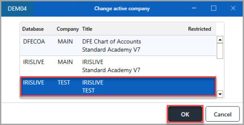 If your establishment/organisation has multiple company databases or a test database for IRIS Financials, you can change connection within the software without having to login again to another database.