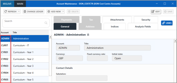 5. Select LINKS > Accounts. The applicable Account Maintenance window is displayed, for example, DON_COSTCTR. These are the list of accounts which are associated with the nominal you are posting to. You must select one of these accounts against the nominal you are posting against.