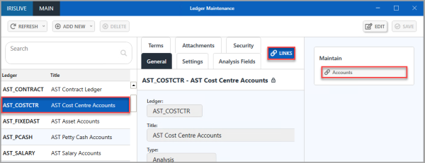 3. Select LINKS > Accounts to view the accounts on the ledger.