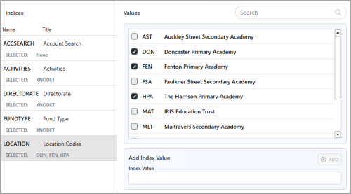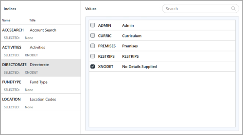 2. Select the applicable index from the centre panel. The available values are then displayed in the right-hand panel. If you are unsure which value to link to the selected index, either select XNODET - No Detail Selected or Required (where applicable), or contact the person within your establishment/organisation who administers your system, i.e. has a CUSTADMIN login for assistance.
